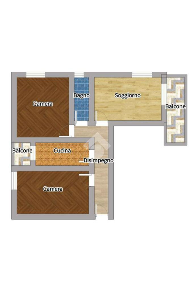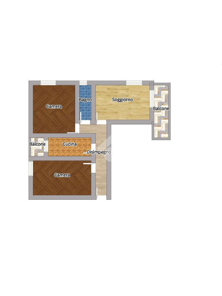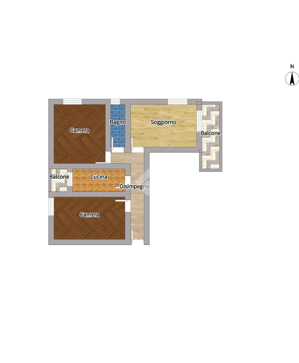 L'appartamento è composto da ingresso che conduce e da accesso al soggiorno con balcone, ampio cucinotto con balcone di servizio, camera matrimoniale, tramite il disimpegno si accede alla seconda camera e al bagno finestrato con vasca.